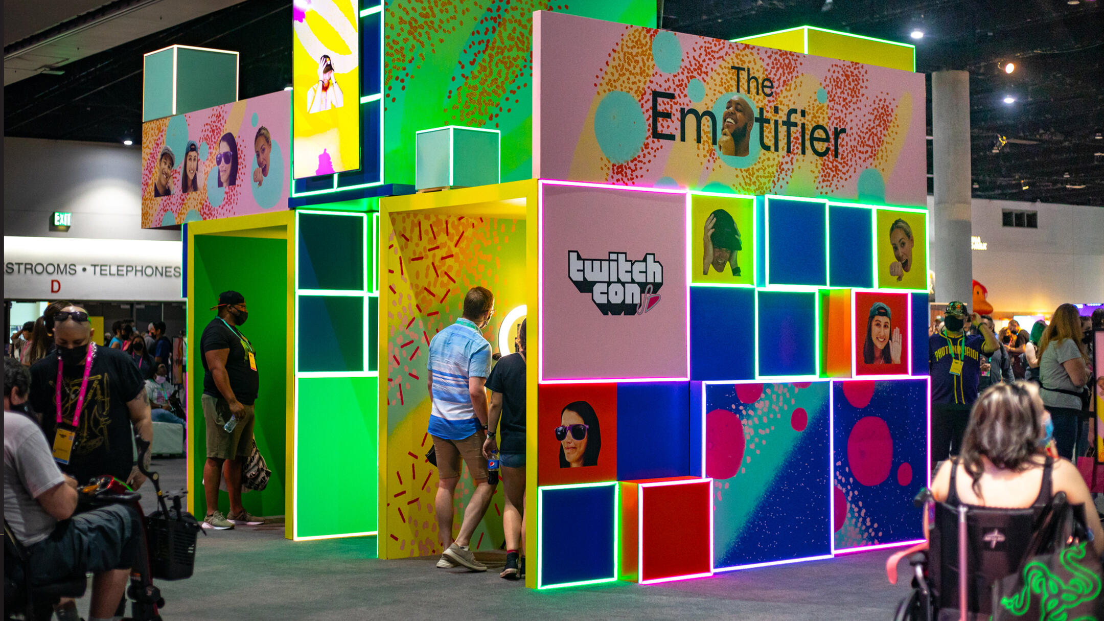 A huge booth for attendees to create their own version of some famous emotes. After the animated emote was created, we even had the chance to showcase some of them on displays around the site. We also created a huge POG head to be used as a photo op.